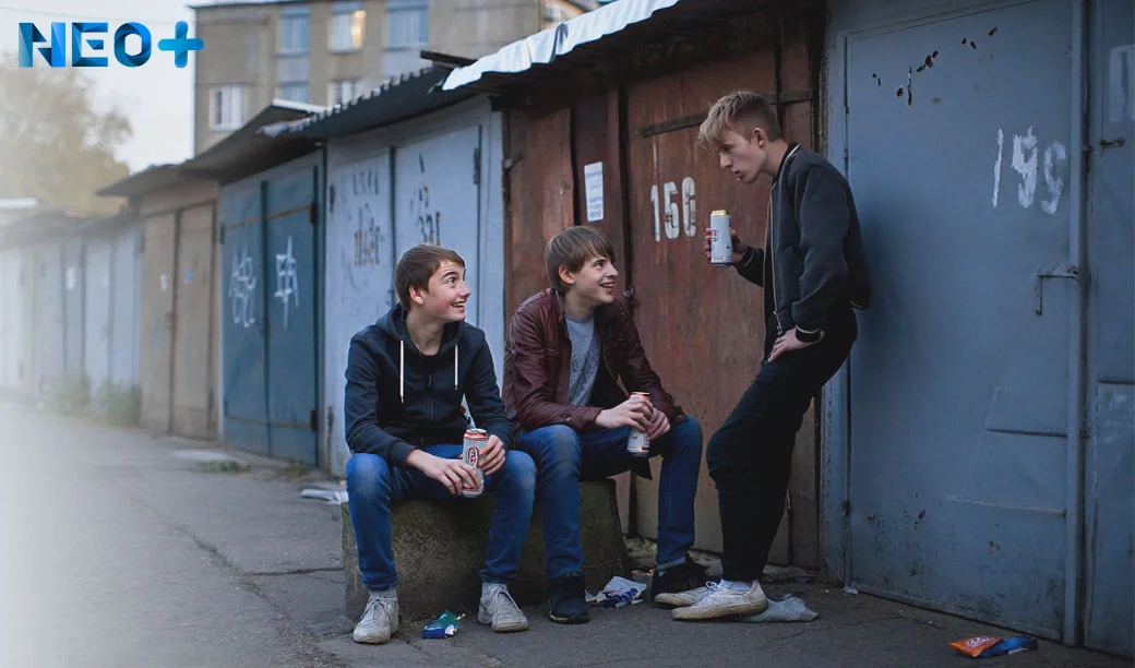 Группа подростков пьет пиво за гаражами